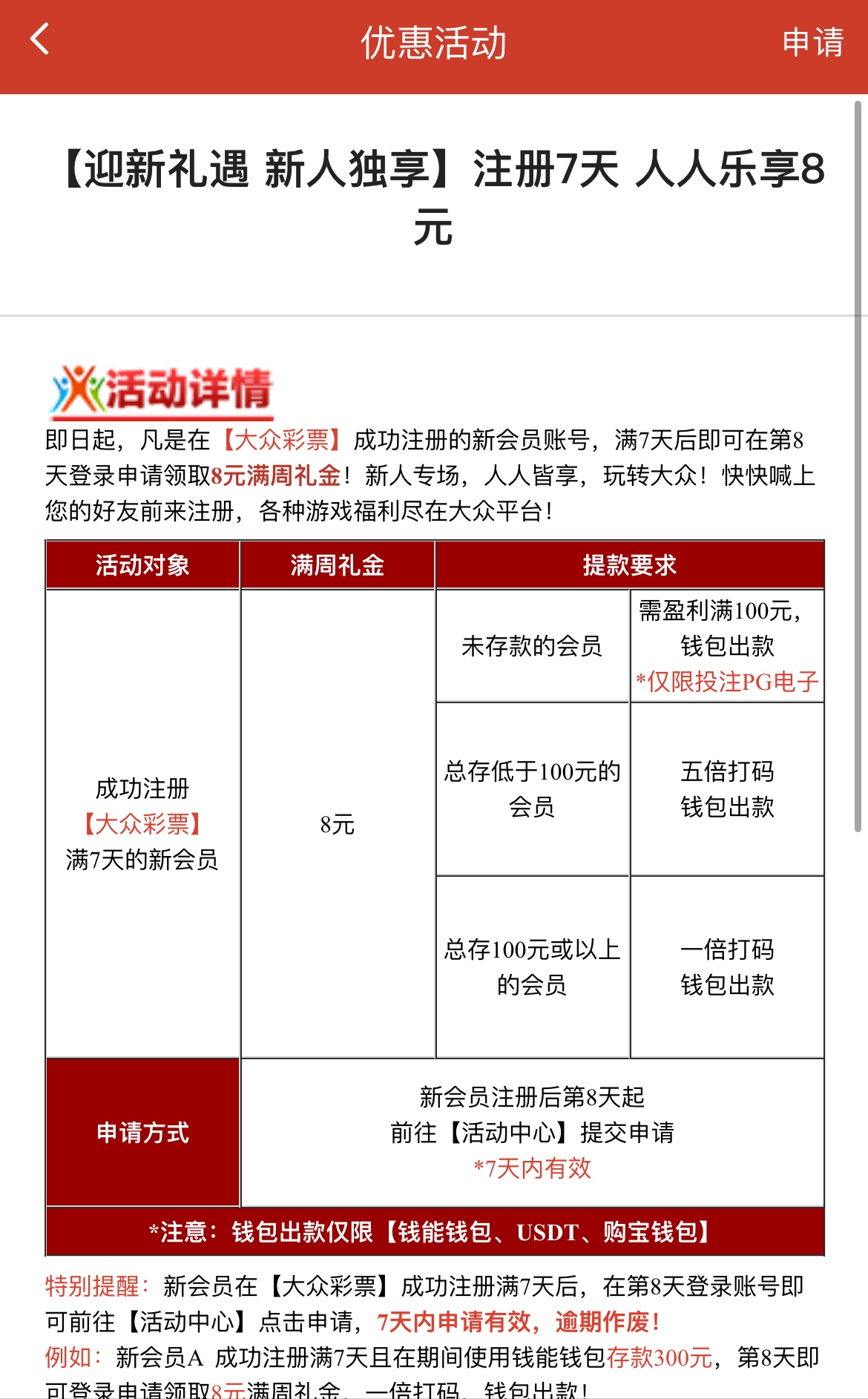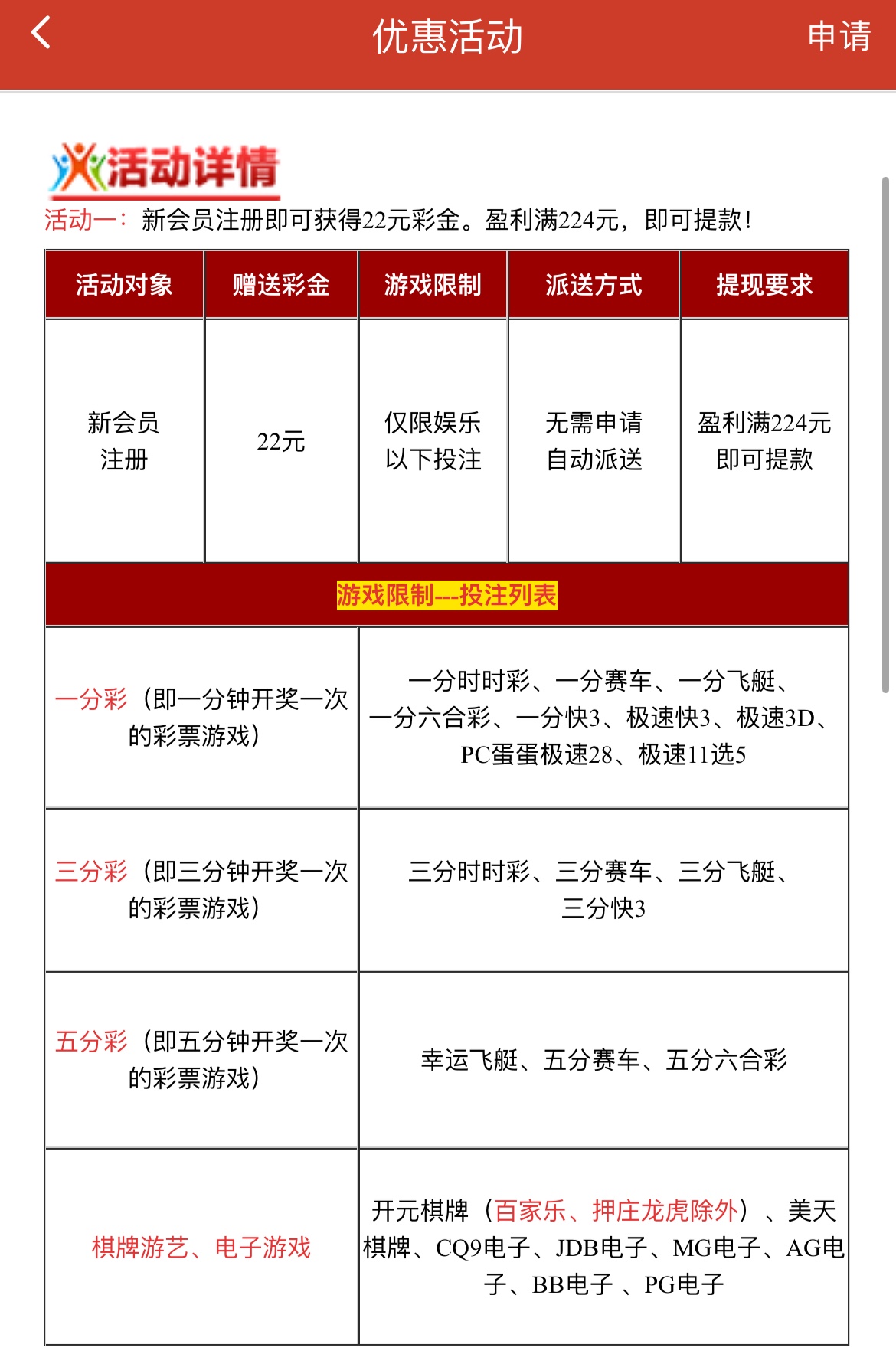 注册完善资料活动申请22限一分彩/三分彩/五分彩/电子/棋牌(百家乐/龙虎斗除外)盈利满224才能取款,下载APP送17可以直接取款,注册满一周送8限PG电子,满100提现,总共送47彩金